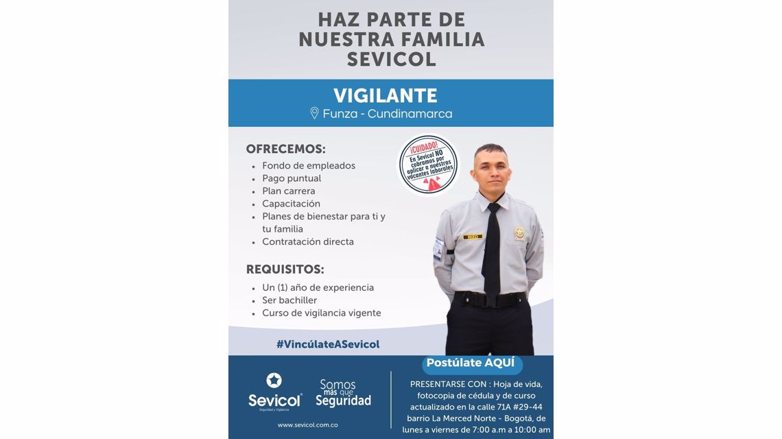 Requisitos: Bachiller, con un año de experiencia o ser reservista, con curso de seguridad vigente y documentación al día. Debe tener conocimiento en control de acceso, normatividad de la seguridad privada, servicio al cliente. Interesados presentarse de lunes a viernes de 08:00 am - 10:00 am con hoja de vida, copia de cédula, certificado de polígono y certificaciones laborales en la Calle 71A N° 29 - 44 Barrio Alcázares barrio La Merced Norte, cerca a la estación av chile en la ciudad de Bogotá o enviar su hoja de vida al 3224170497.